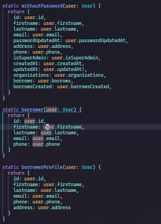 export type UserBorrowerPresenter = ReturnType<typeof UserPresenter.borrower> export type UserBorrowerProfilePresenter = ReturnType<typeof UserPresenter.borrowerProfile> export default UserPresenter { static borrower(user: User) { return { id: user.id, firstname: user.firstname, lastname: user.lastname, email: user.email, phone: user.phone } } static borrowerProfile(user: User) { return { id: user.id, firstname: user.firstname, lastname: user.lastname, email: user.email, phone: user.phone, address: user.address } } }Copied!